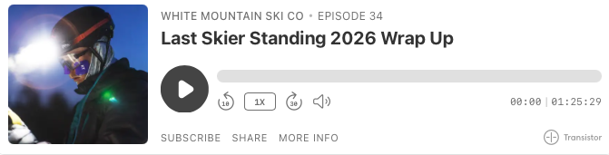 Thanks to Fischer Skis for introducing me to the event—of which they are the primary sponsor—and for getting me to it. Thanks to Christian Eaton, Torey Brooks, and Colby Decker for knowing exactly what to say and when to say it. Thanks to Andrew Drummond and Monte Rufus McIndoe for agreeing to allow us to attempt 100 hours without batting an eye, and for putting on a wonderful event among my favorite ski community in the world. And thanks to the participants, volunteers, and crew for letting me drop into their scene and welcoming me with open arms.